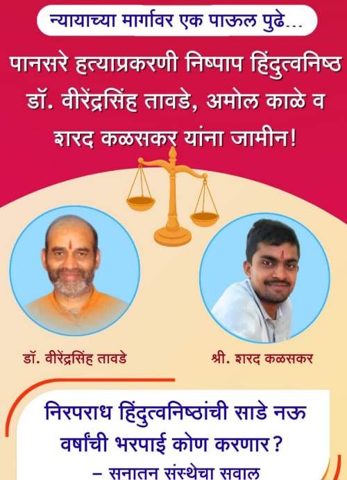 *पानसरे हत्याप्रकरणी निष्पाप हिंदुत्वनिष्ठ डॉ. तावडे, अमोल काळे व शरद कळसकर यांना जामीन!,निरपराध हिंदुत्वनिष्ठांची साडे नऊ वर्षांची भरपाई कोण करणार?–सनातन संस्थेचा सवाल*